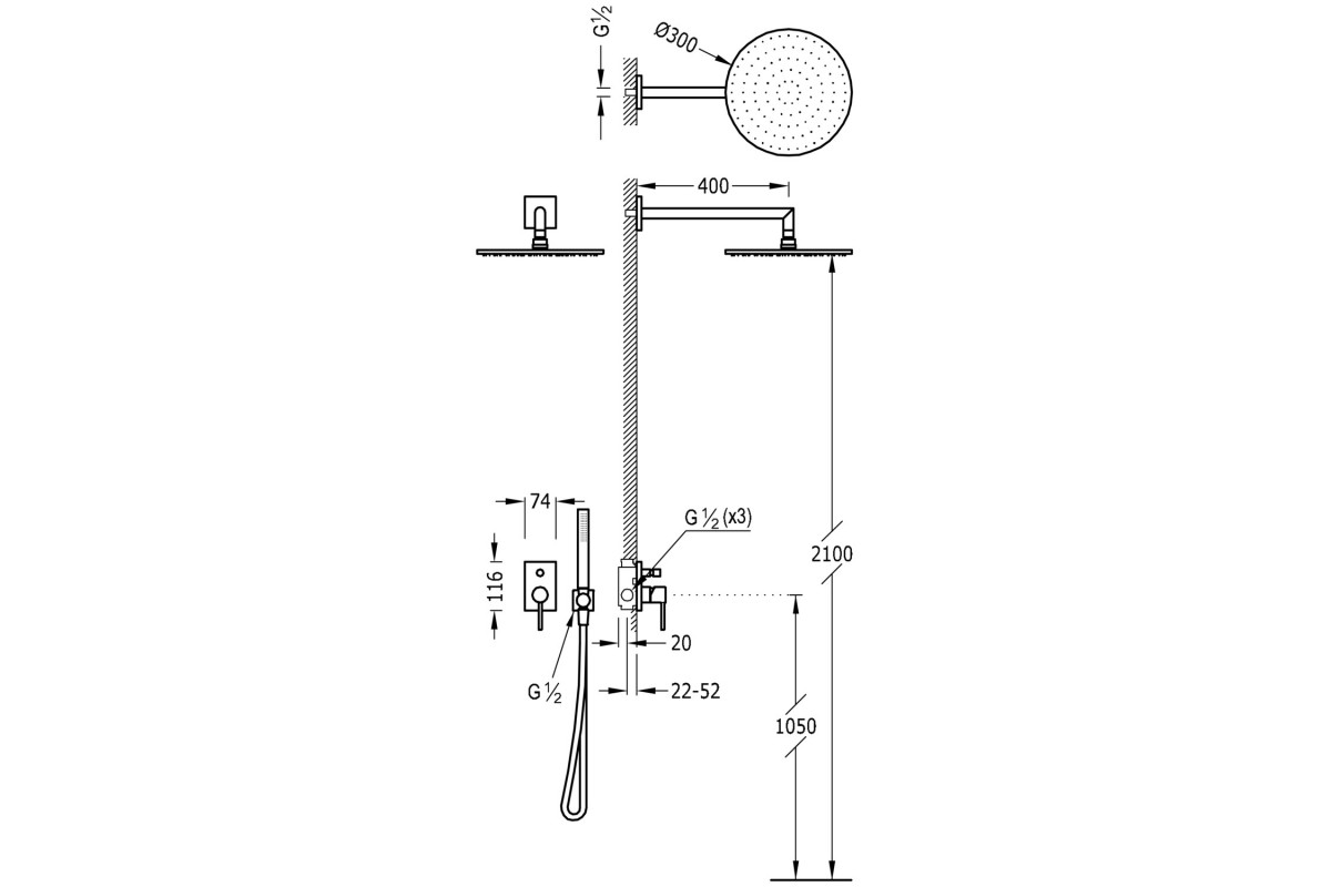 06298001 Max встр сме-ль .д/ванны с верх душ 30 см из стены+лейка все металл
