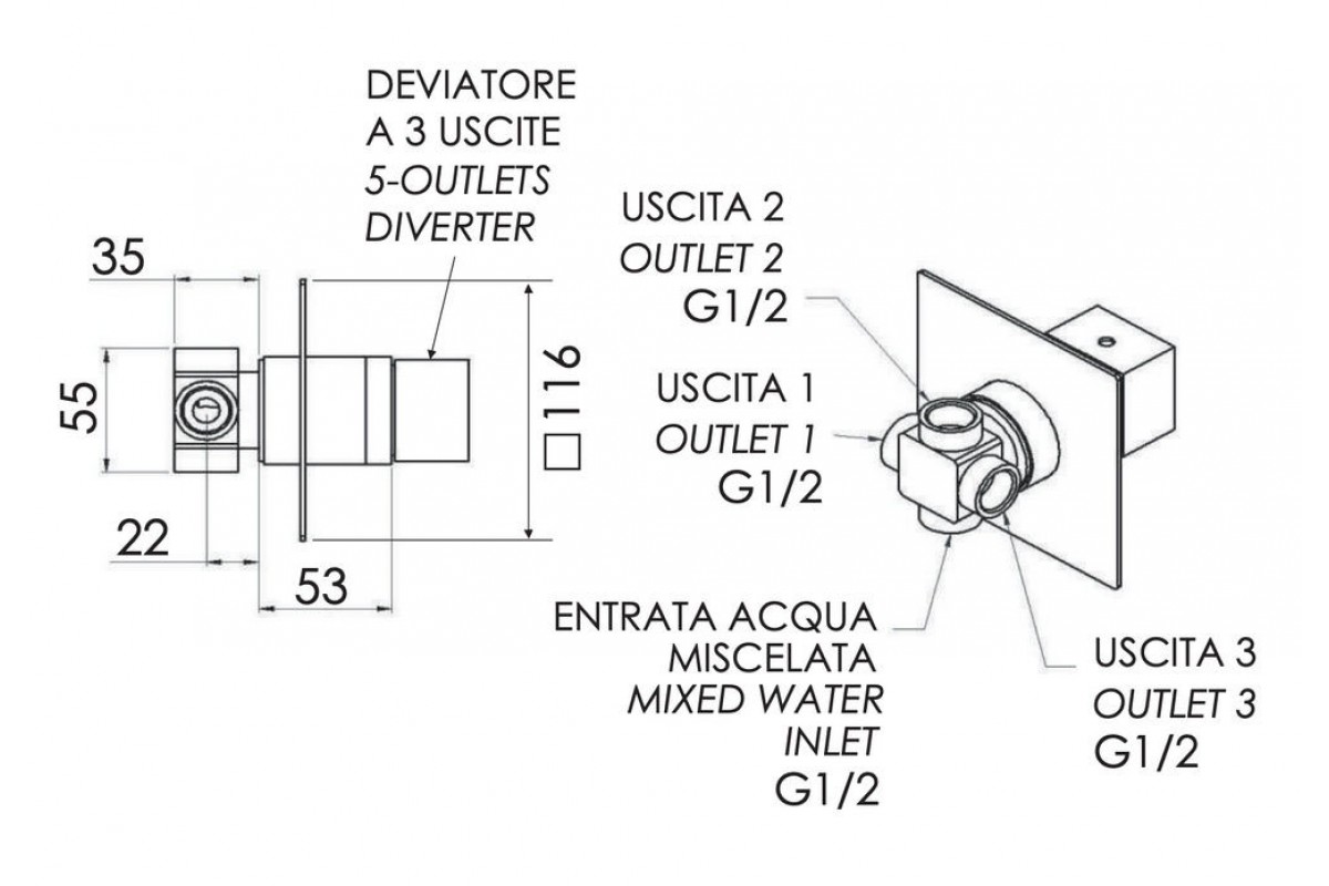Дивертер на 3 выхода Remer Qubika Q93DEV3NO, черный матовый