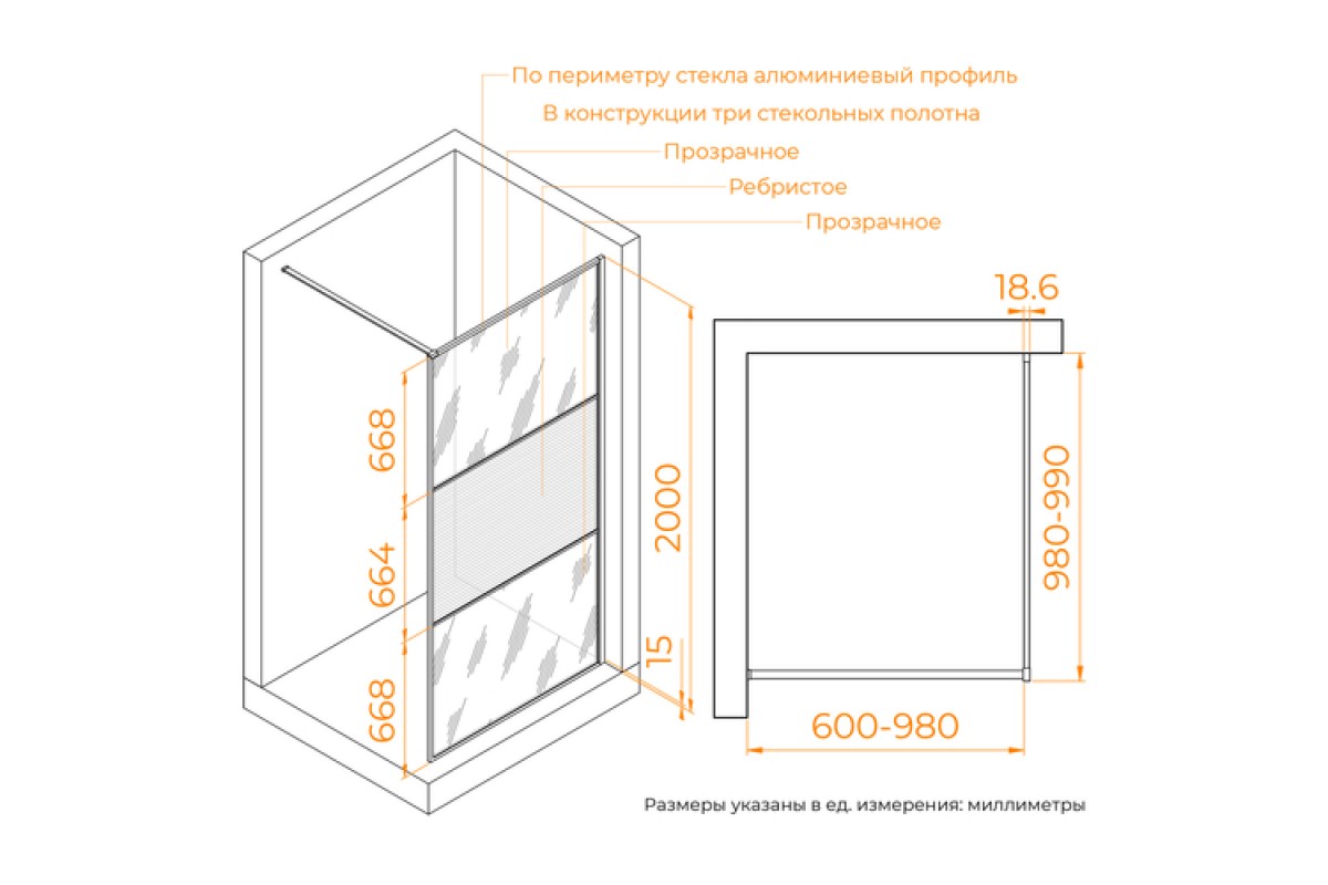 Душевая перегородка RGW 100x200 WA-09B стекло рифленое 8мм, профиль матовый черный
