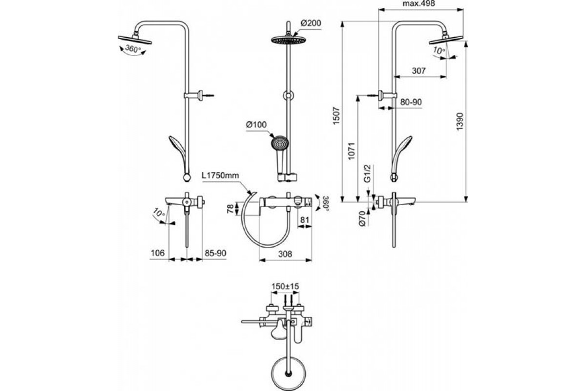 Душевая система Ideal Standard Idealrain Cerafine O Black BC749XG для ванны и душа