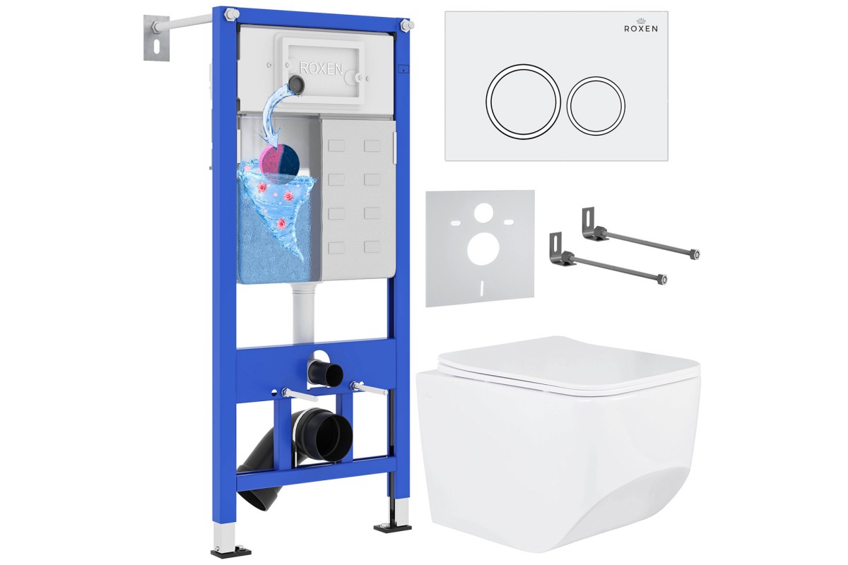 Вышеприведенная информация получена из открытых источников, в том числе с официальных сайтов и из каталогов производителей. При получении заказа ОБЯЗАТЕЛЬНО обращайте внимание на важные для вас параметры и характери... Подробнее...состоит из : 1. cистема инсталляции для унитаза Roxen StounFix Dual Fresh 710200 2. подвесного унитаза Boro 530145-01 3. крышки для подвесного унитаза Boro 530145-01, 4. кнопки для инсталляции Roxen Santi 410260W 5. удлиненный комплект креплений к стене 6. звукоизолирующая панель