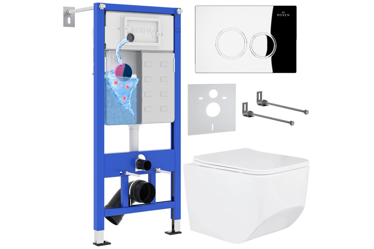 Вышеприведенная информация получена из открытых источников, в том числе с официальных сайтов и из каталогов производителей. При получении заказа ОБЯЗАТЕЛЬНО обращайте внимание на важные для вас параметры и характери... Подробнее...состоит из : 1. cистема инсталляции для унитаза Roxen StounFix Dual Fresh 710200 2. подвесного унитаза Boro 530145-01 3. крышки для подвесного унитаза Boro 530145-01, 4. кнопки для инсталляции Roxen Santi 410260CH 5. удлиненный комплект креплений к стене 6. звукоизолирующая панель
