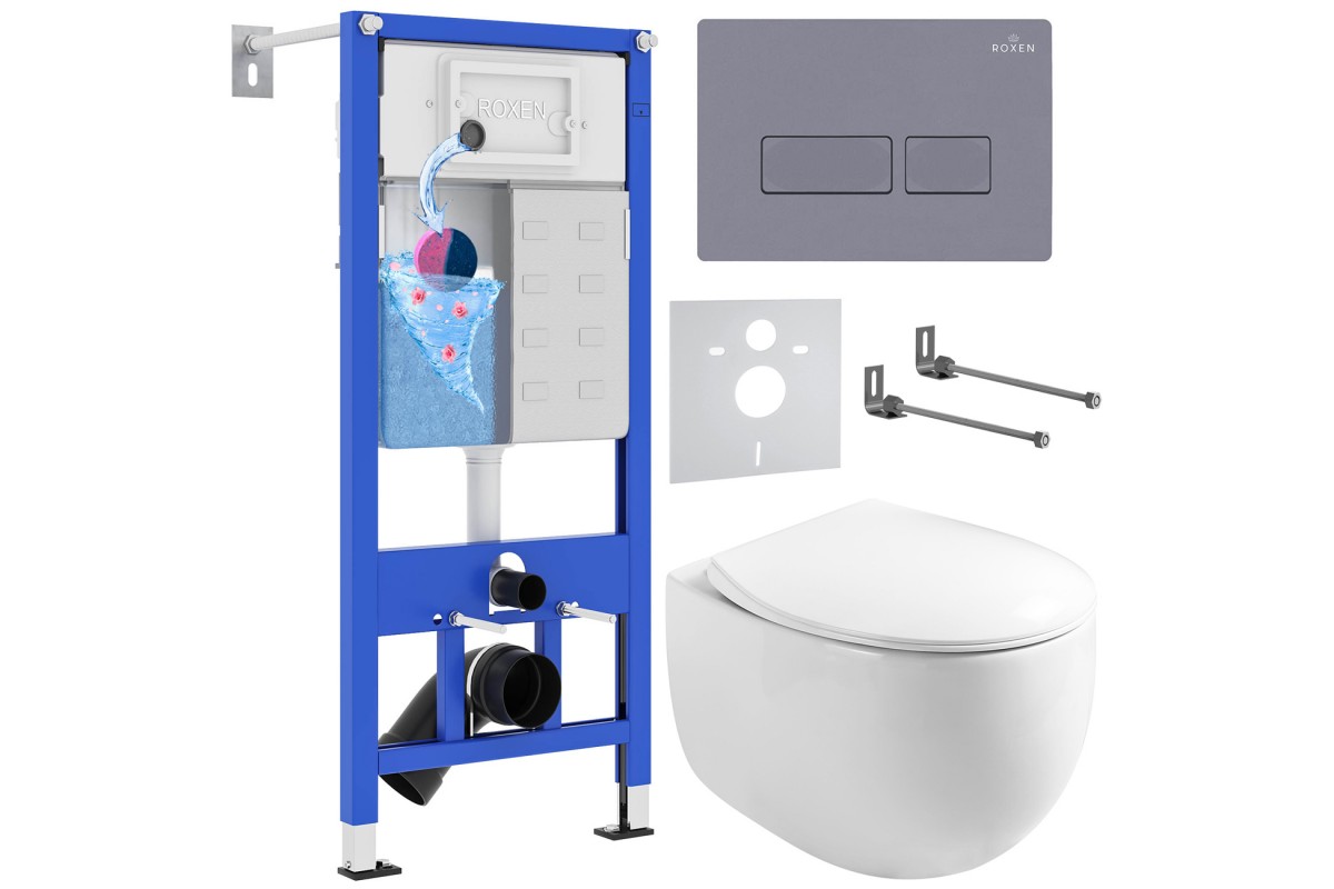 Вышеприведенная информация получена из открытых источников, в том числе с официальных сайтов и из каталогов производителей. При получении заказа ОБЯЗАТЕЛЬНО обращайте внимание на важные для вас параметры и характери... Подробнее...состоит из : 1. cистема инсталляции для унитаза Roxen StounFix Dual Fresh 710200 2. подвесного унитаза Egg 530170-01 3. крышки для подвесного унитаза Egg 530170-01, 4. кнопки для инсталляции Roxen Caspia 410280DG 5. удлиненный комплект креплений к стене 6. звукоизолирующая панель