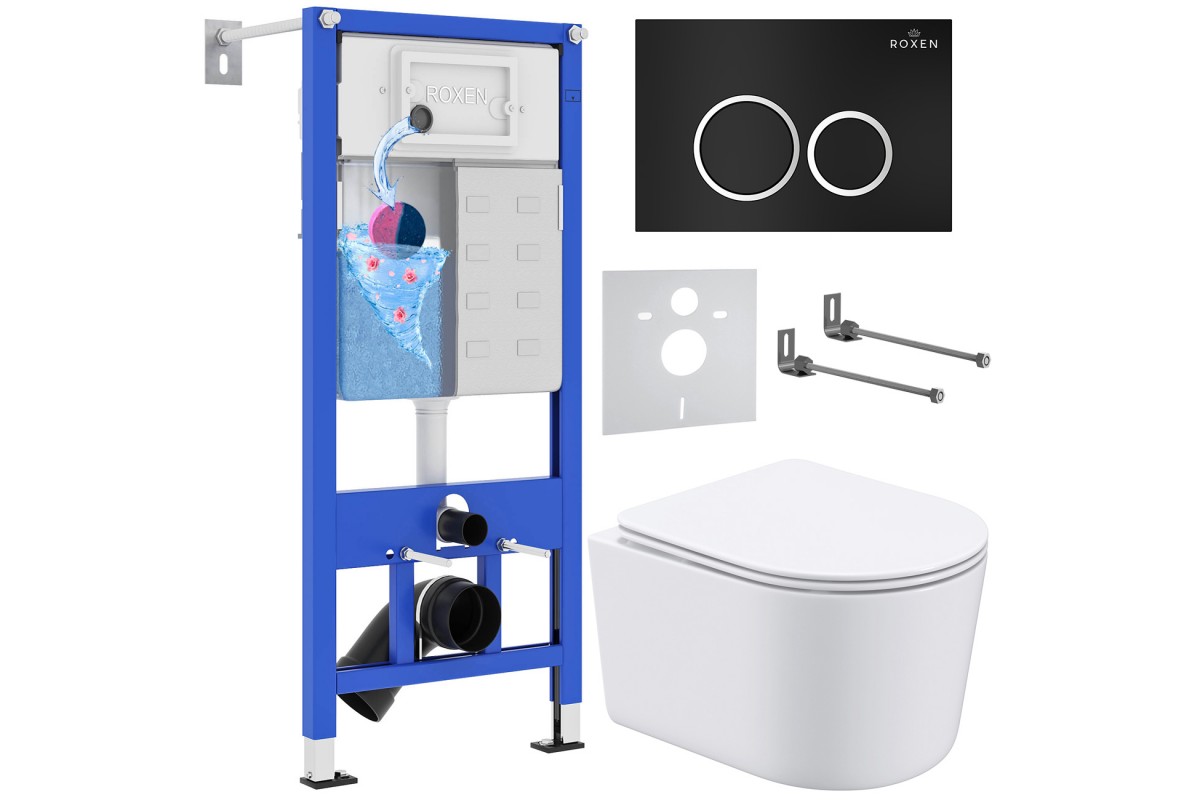 Вышеприведенная информация получена из открытых источников, в том числе с официальных сайтов и из каталогов производителей. При получении заказа ОБЯЗАТЕЛЬНО обращайте внимание на важные для вас параметры и характери... Подробнее...состоит из : 1. cистема инсталляции для унитаза Roxen StounFix Dual Fresh 710200 2. подвесного унитаза Simple Compact 530120-01 3. крышки для подвесного унитаза Simple Compact 530120-01, 4. кнопки для инсталляции Roxen Santi 410260B 5. удлиненный комплект креплений к стене 6. звукоизолирующая панель