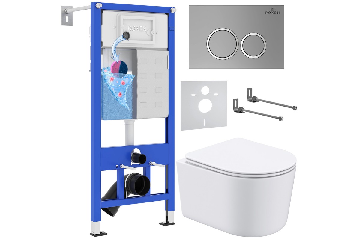 Вышеприведенная информация получена из открытых источников, в том числе с официальных сайтов и из каталогов производителей. При получении заказа ОБЯЗАТЕЛЬНО обращайте внимание на важные для вас параметры и характери... Подробнее...состоит из : 1. cистема инсталляции для унитаза Roxen StounFix Dual Fresh 710200 2. подвесного унитаза Simple Compact 530120-01 3. крышки для подвесного унитаза Simple Compact 530120-01, 4. кнопки для инсталляции Roxen Santi 410260M 5. удлиненный комплект креплений к стене 6. звукоизолирующая панель