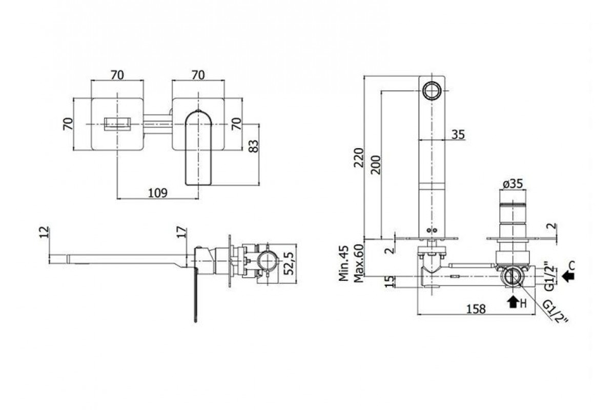 Paffoni Смеситель для раковины встраиваемый с изливом 200мм с накладками из нерж. Стали 2 шт. 70х70мм