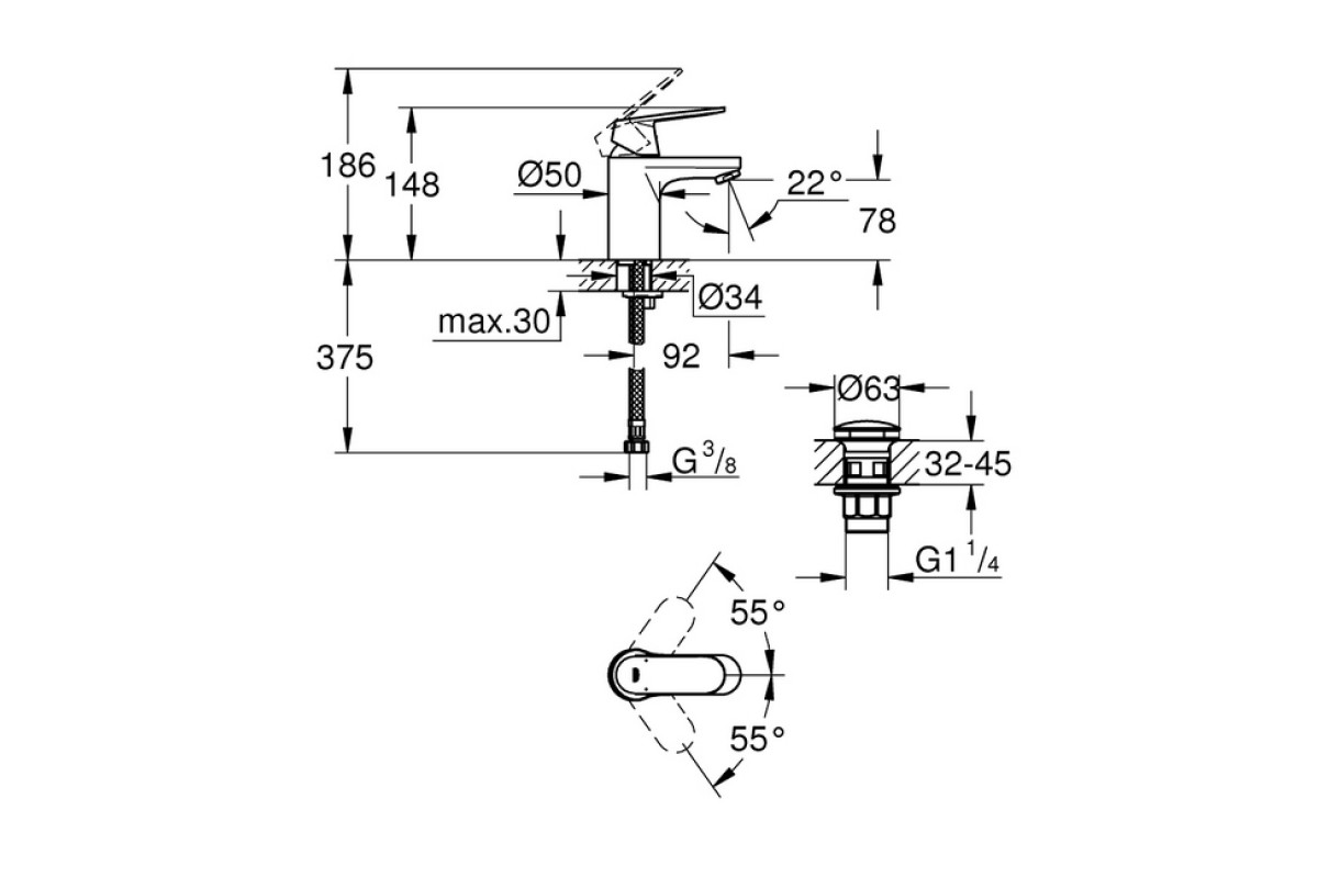 Смеситель для раковины GROHE Eurosmart Cosmopolitan однорычажный, DN 15 S-Size (23925000)