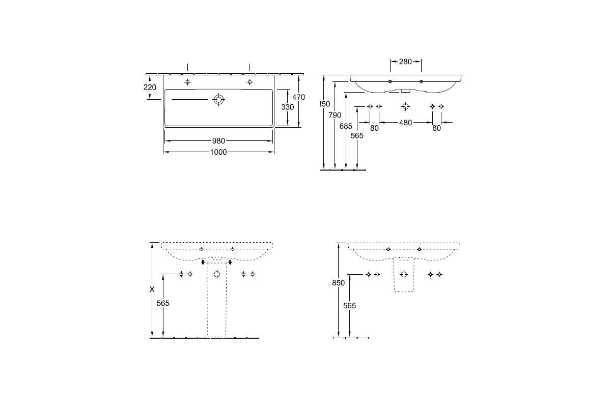 Умывальник Villeroy&Boch Avento, 1000 x 470 мм для установки на тумбу 4156A501