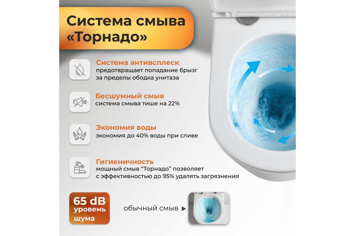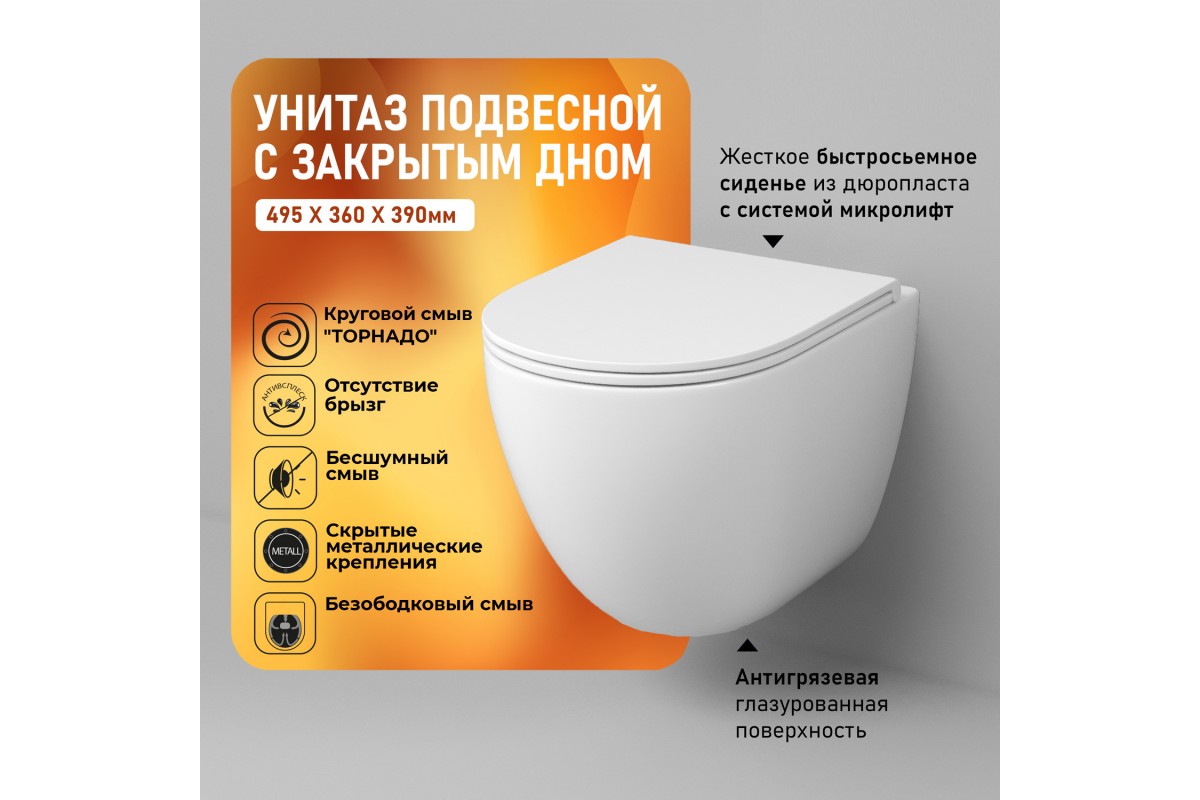 Унитаз Grossman Tornado GR-4455 SQC подвесной, безободковый, смыв Торнадо, с сиденьем микролифт, цвет белый глянцевый 49x34x38,5